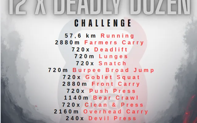 Soit ((57,600m of Running. 2880m of Farmers Carry, 720x Deadlift, 720m of Lunges, 720x Snatch, 720m of Burpee Broad Jump, 720x Goblet Squat, 2880m of Front Carry, 720x Push Press, 1140m of Bear Crawl, 720x Clean & Press, 2160m Overhead Carry, 240x Devil Press).